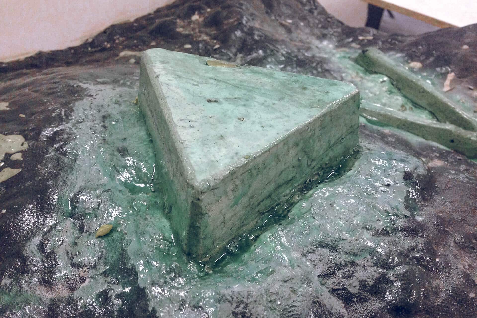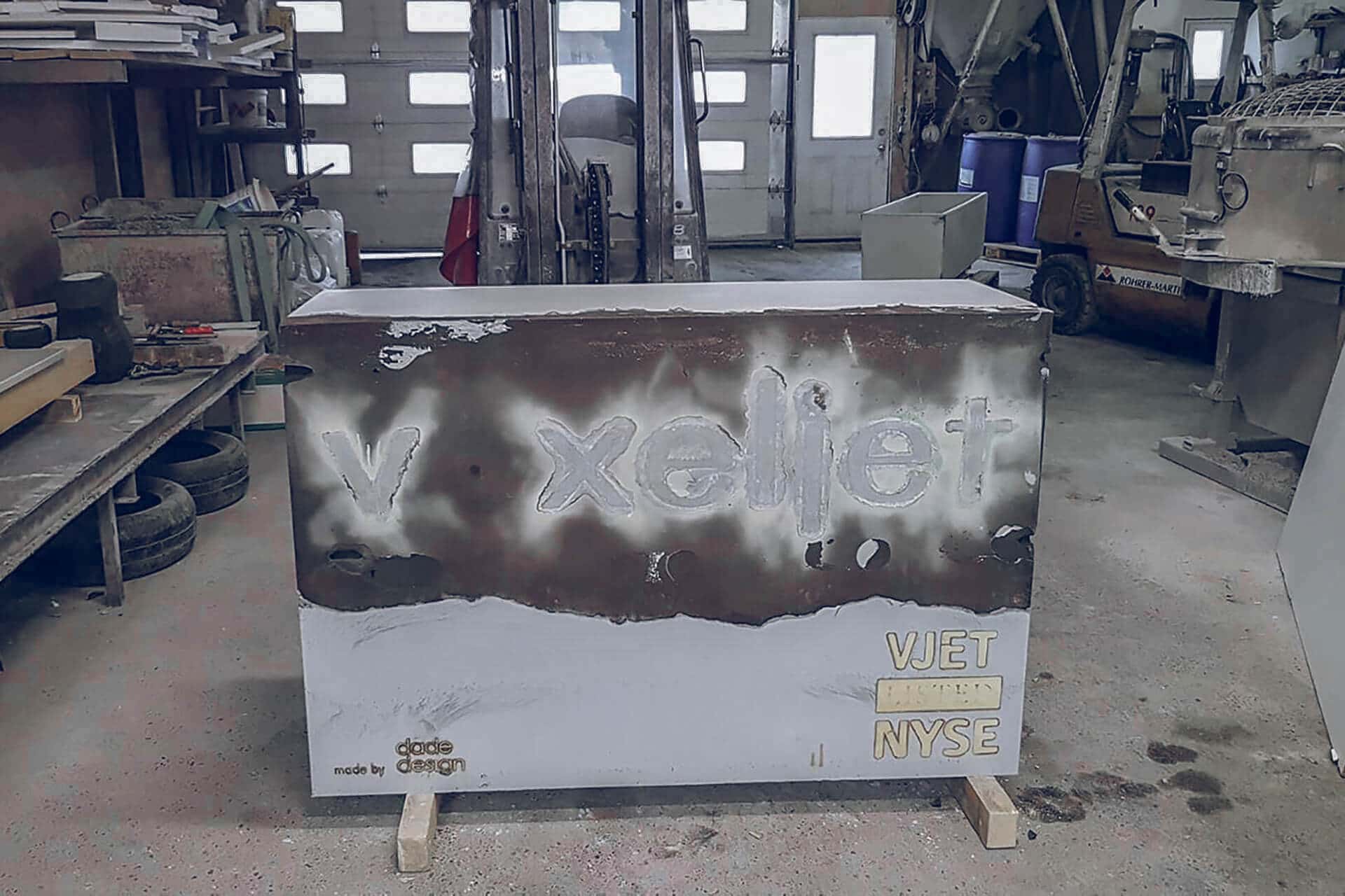 Nach dem Aushärten des gedruckten Logos, goss Dade Design im zweiten Schritt den Rest des Firmensteins. Dafür verwendeten die Betongießer einen selbstverdichtenden Beton, UHPC (Ultra-High Performance Concrete). Bereits nach rund 20 Stunden war der Beton komplett ausgehärtet, und die Schalung konnte vorsichtig entfernt werden. Schon nach dem Entfernen der Schalung war der voxeljet-Firmenstein so gut wie fertig. Für den finalen Schliff verliehen Mitarbeiter von Dade-Design dem Stein eine sogenannte Betonkosmetik, wobei sie den Beton polierten, um eine gleichmäßige und glatte Oberfläche zu erhalten.