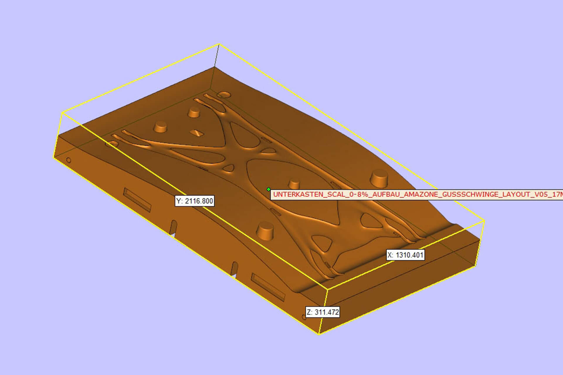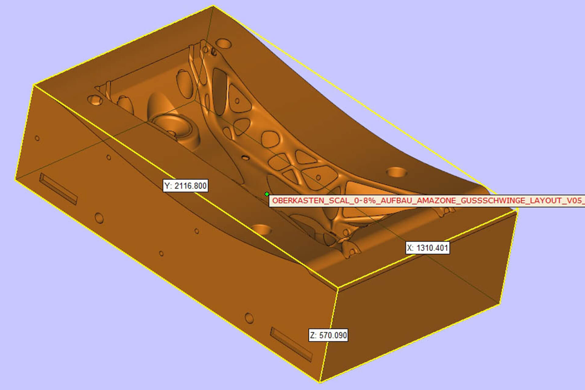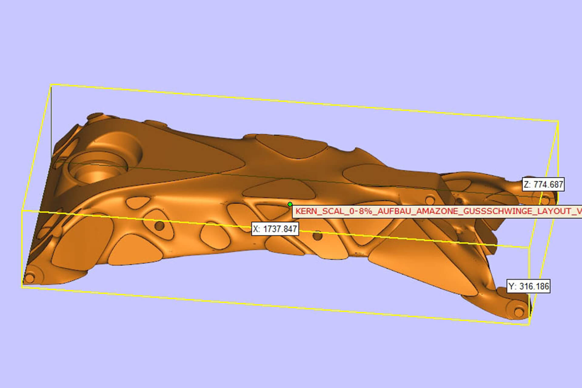Die Fahrwerksschwinge verbindet das Gerät mit der Achse, um einen Transport des Gerätes vom Hof zum Feld zu ermöglichen. Die ursprüngliche Schweißkonstruktion mit einem Gewicht von 245 Kilogramm und einer Schweißnahtlänge von 16,5 Metern war sehr komplex und fertigungsintensiv. Um Kosten zu reduzieren und das Bauteil stabiler und leichter zu gestalten, hat sich Amazone dazu entschieden, die Fahrwerksschwinge durch eine Gussbaugruppe zu ersetzen. Mithilfe der Topologieoptimierungssoftware „Inspire“ von Altair konnte das Entwicklerteam von Amazone ein lastgerechtes und gießfähiges Design ableiten.