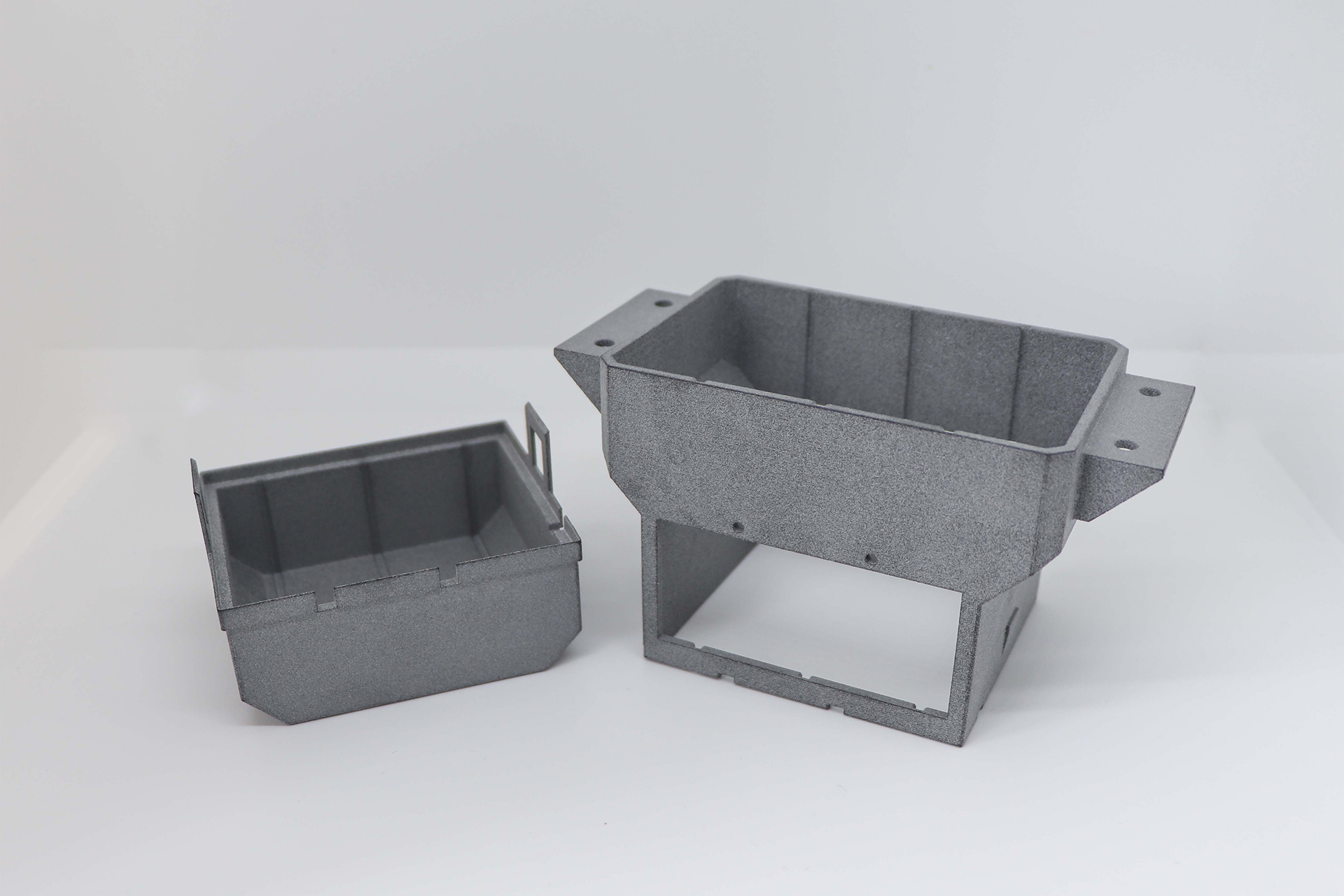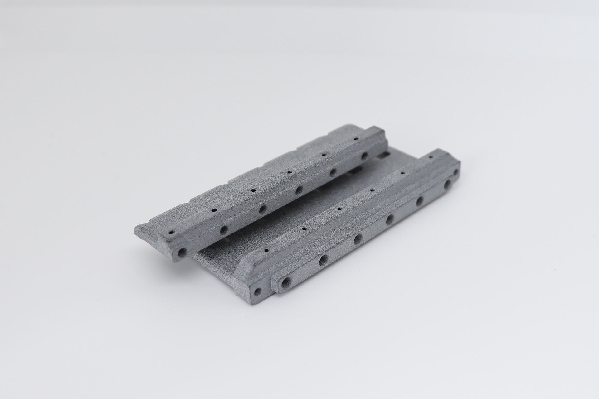 Bei unserer High Speed Sintering (HSS) Technologie handelt es sich um ein Polymer-Sinterverfahren, dass für die Herstellung dieser Bauteile ideal geeignet ist. Die Datenübertragung auf ein HSS-Drucksystem ist binnen Minuten abgewickelt und schon am nächsten Tag können die Bauteile zur Montage bereitliegen. Das Material der Wahl für diese Bauteile war in diesem Fall ein klassisches Polyamid 12 (PA12). Eine solche