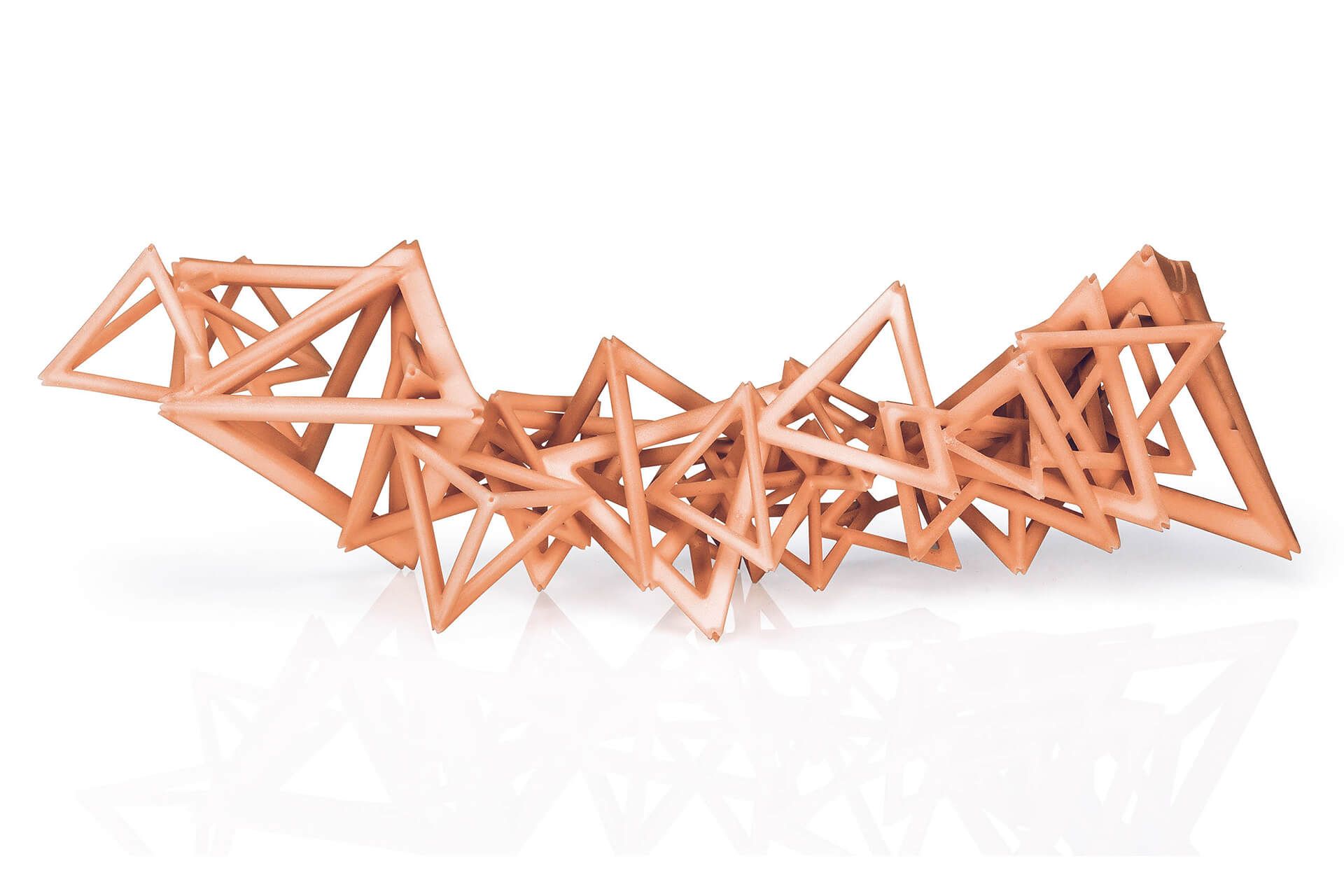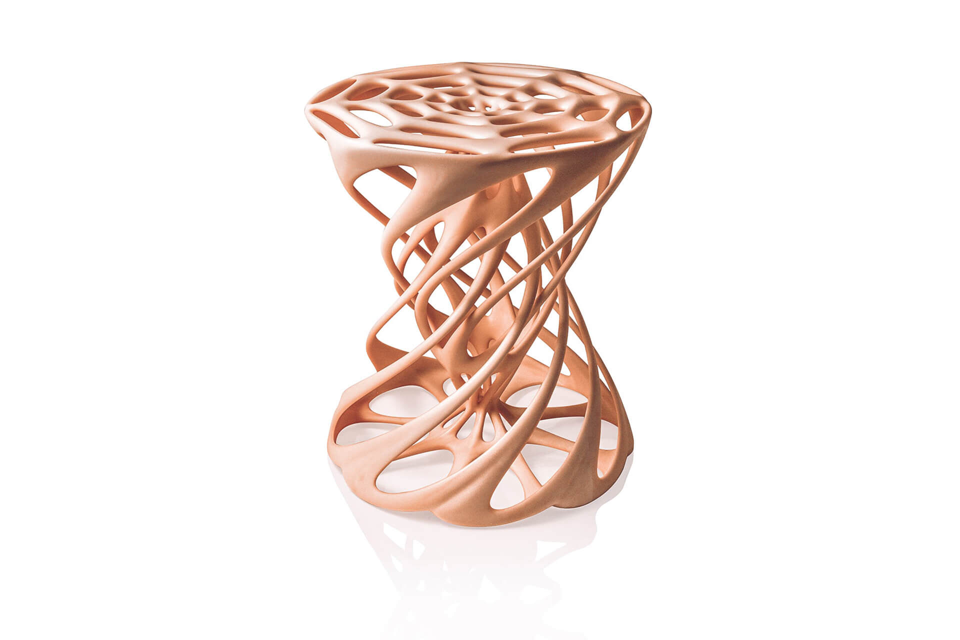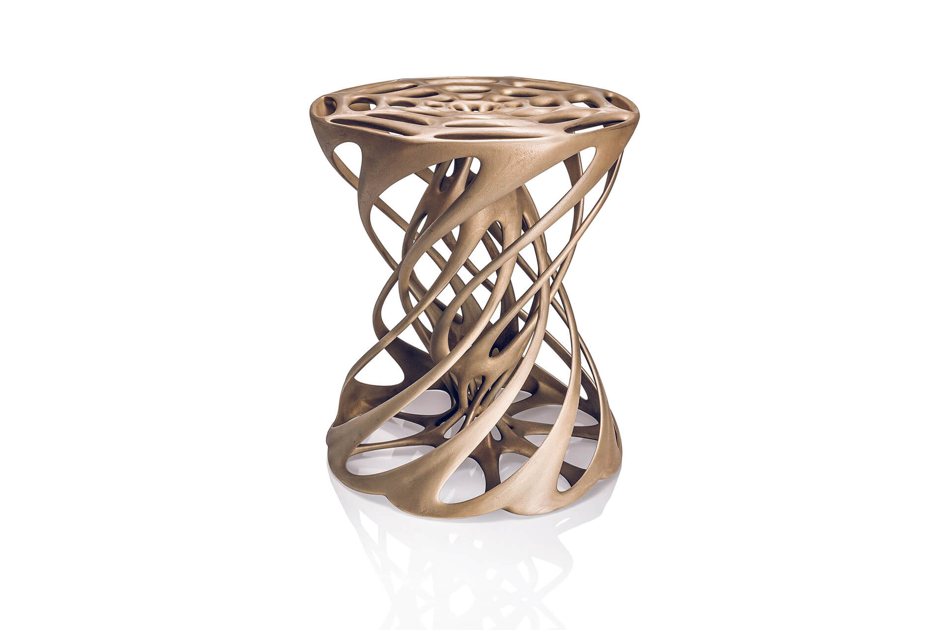 KAS steht für Kinetic Assembly Structure und spiegelt die Materialisierung eines digitalen Gedankenganges wider. Beim näheren Beschauen der zahlreichen Konturen des Hockers stellt der Betrachter fest, dass die Linien immer eine Endlosschleife bilden. KAS und Infiniala zeigen die einzigartigen Möglichkeiten in der Umsetzung von hochkomplexen, digital erstellten Kunstwerken. Die aufwendigen verschachtelten Geometrien können nur durch den Einsatz von additiven Verfahren, wie dem Binder-Jetting von voxeljet, realisiert werden. Die Herstellung eines Gussrohlings mit herkömmlichen Abformungsverfahren wäre unmöglich.
