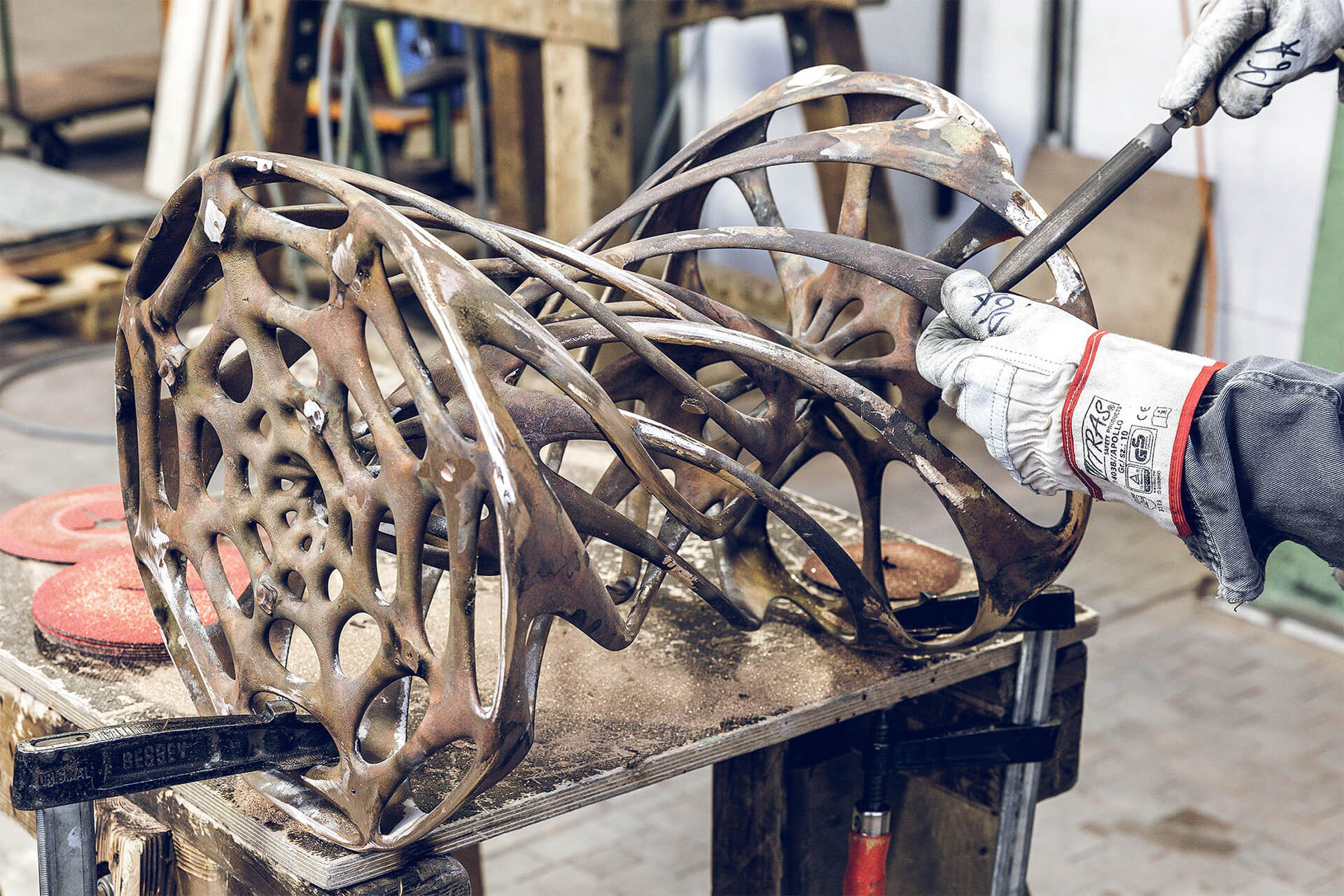 Ist der Gussprozess abgeschlossen, beginnt die Arbeit der Ziseleure und Patineure. Ein Service, den Strassacker-Kunden besonders schätzen. In intensiver Zusammenarbeit mit dem Künstler wird hier gemeinsam das endgültige Erscheinungsbild eines Werks gestaltet. Mit eigens hergestellten Punzen arbeiten die Ziseleure selbst feinste Strukturen präzise heraus. Mehrteilig gegossene Stücke werden durch ein speziell entwickeltes Schweißverfahren so zusammengefügt, dass am vollendeten Kunstwerk keine Schweißnähte mehr erkennbar sind. Auch der Bambi bekommt hier erst seine hochglanzpolierte Oberfläche. Zu guter Letzt geben die Patineure den Werken ihre Farbe, in dem sie den natürlichen Vorgang der Oxidation durch chemische Reaktionen vorwegnehmen. Auch hier ist höchstes handwerkliches Können notwendig, um geplante Farbnuancen präzise zu treffen.