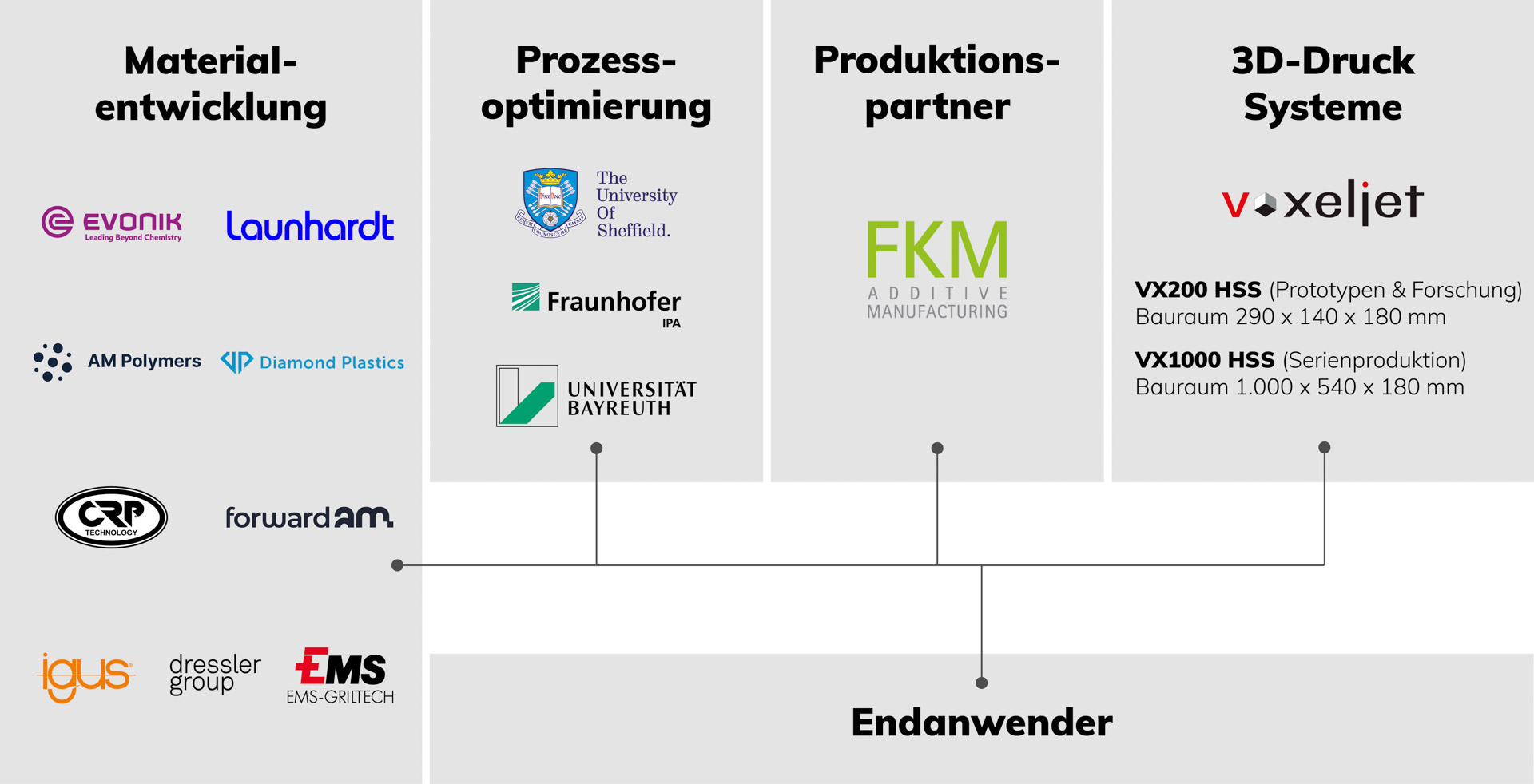 Nach erfolgreicher Installation der VX1000 HSS hat sich FKM dem HSS Polymer Netzwerk von voxeljet als Produktionspartner angeschlossen. Das Netzwerk arbeitet interdisziplinär und kollaborativ und hat sich zum Ziel gesetzt, Wissen über 3D-druckbare Materialien und deren Versinterungsstrategie für das HSS-Verfahren zu generieren und neue Materialien zu qualifizieren. Nachdem das Netzwerk ursprünglich auf F&E ausgerichtet war, wird es nun mit dem ersten Produktionspartner erweitert. Somit steht Kunden nun eine End-to-End Lösung von der Materialforschung bis zur Teileproduktion zur Verfügung.